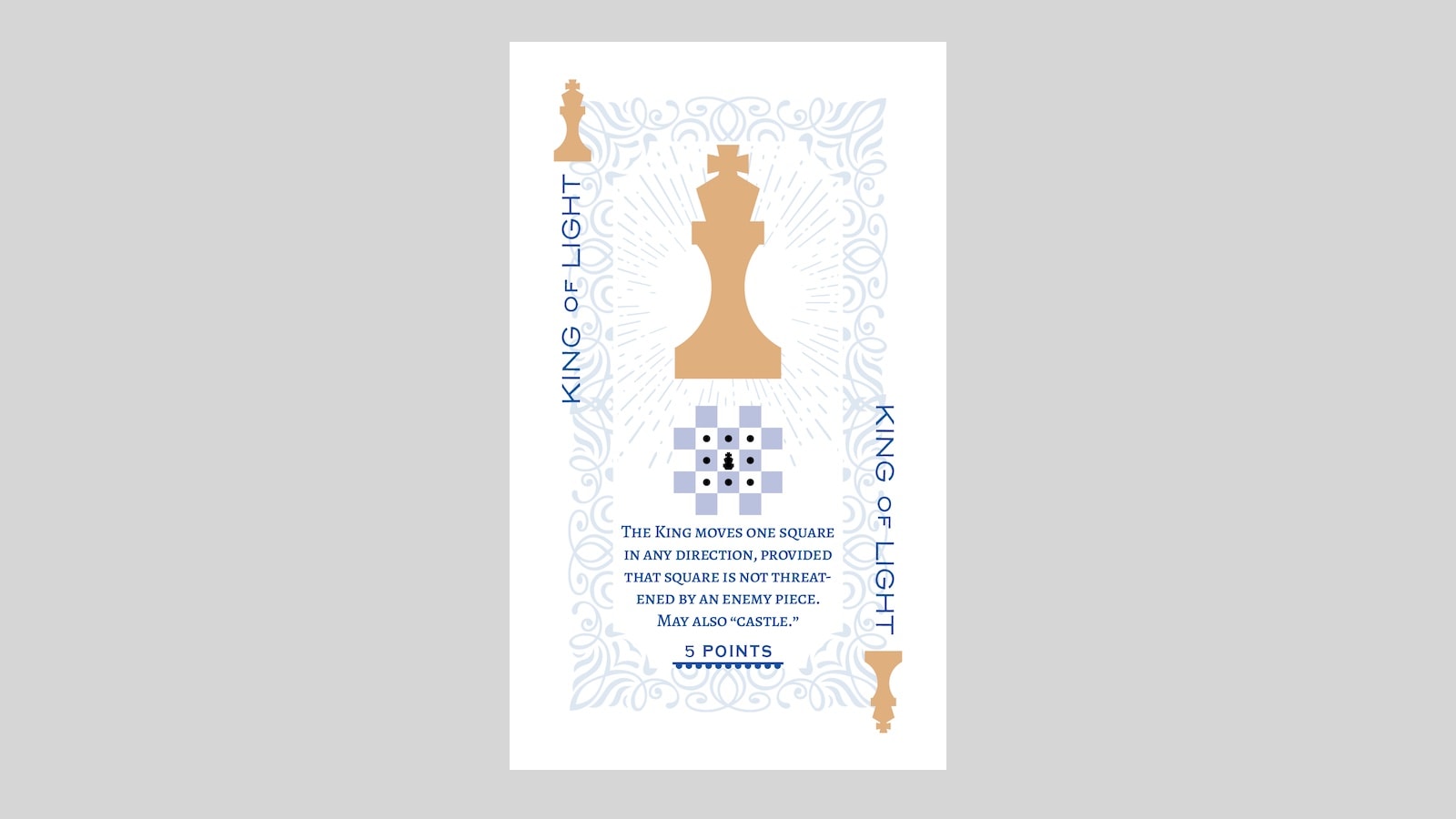 Made up of 70 cards—64 game cards and 6 information cards—the game works with any traditional chess set.