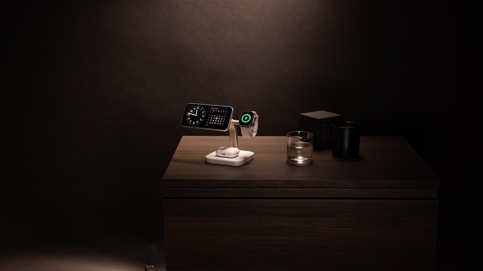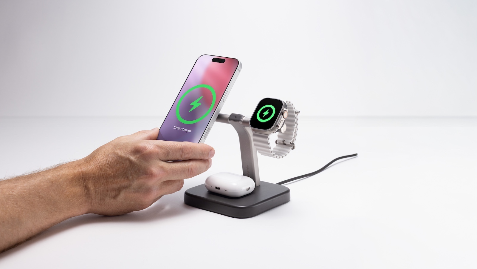 Charge an iPhone, Apple Watch, and AirPods on a single stand—the mophie 3-in-1 Wireless Charging Stand! The magnetic alignment starts charging instantly and keeps a desk tidy.