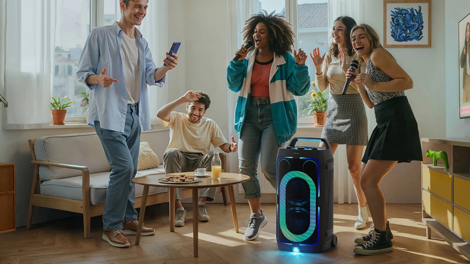 - Party Lights +: Five mood presets and 6 dynamic patterns sync LEDs to music beats, creating a 360-degree light show via the Samsung app.