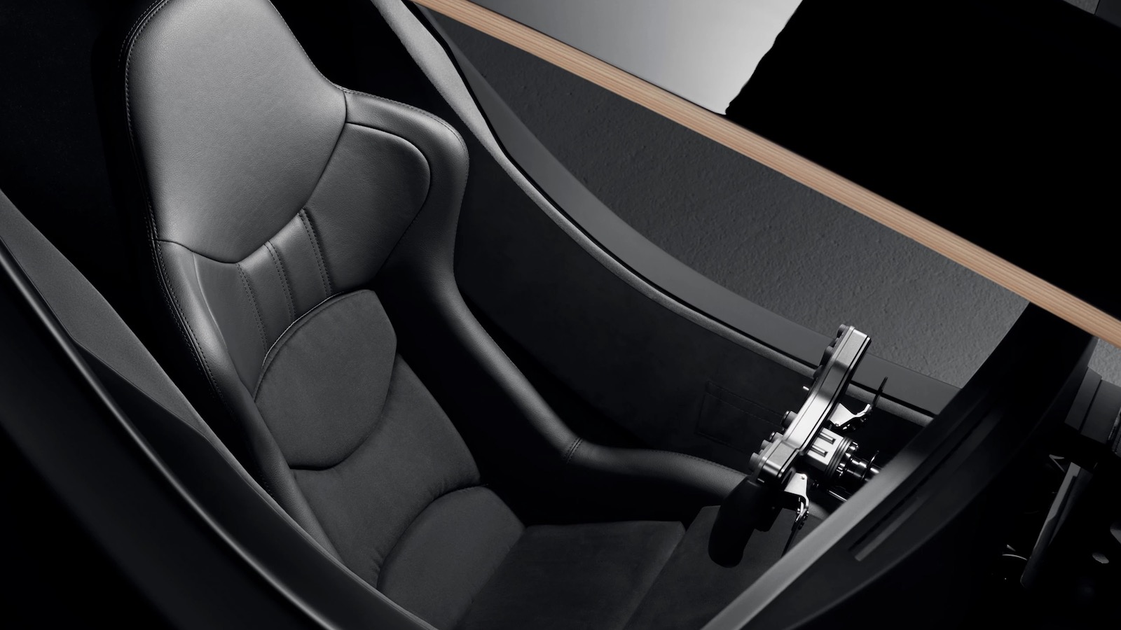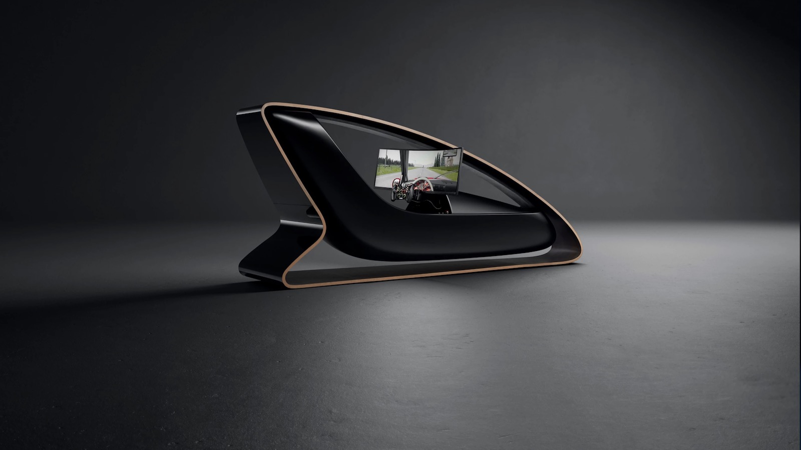Additionally, the screen, steering wheel, and pedal box appear to float beneath a striking canopy of 16 layers of birch.